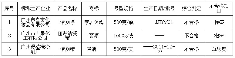 ????近期,廣州市質(zhì)量技術(shù)監(jiān)督局對本市生產(chǎn)領(lǐng)域衛(wèi)生潔具清潔劑產(chǎn)品質(zhì)量進(jìn)行了監(jiān)督抽查,共抽查了9家企業(yè)生產(chǎn)的9批次產(chǎn)品,經(jīng)檢驗(yàn)有3家企業(yè)的3批次產(chǎn)品不符合標(biāo)準(zhǔn)要求。 ????本次抽查依據(jù)國家標(biāo)準(zhǔn)GB/T 21241-2007《衛(wèi)生潔具清洗劑》等標(biāo)準(zhǔn),對外觀、氣味、色澤、狀態(tài)、雜質(zhì)、泡沫、乳化力、比重、pH值、總五氧化二磷(P2O5)含量、對瓷面的腐蝕性試驗(yàn)、總活性物含量、耐熱穩(wěn)定性、耐寒穩(wěn)定性、穩(wěn)定性、總酸度、表面活性劑含量、標(biāo)簽等項(xiàng)目進(jìn)行檢驗(yàn)。 ????主要不合格項(xiàng)目及情況分析 ????1、總酸度:本次抽查有1批次產(chǎn)品不合格。該項(xiàng)目是決定衛(wèi)生潔具清洗劑去污能力和對衛(wèi)生潔具腐蝕性的關(guān)鍵指標(biāo),也是評價衛(wèi)生潔具清洗劑產(chǎn)品質(zhì)量的主要指標(biāo),其是否符合標(biāo)準(zhǔn)要求直接影響產(chǎn)品的去污能力??偹岫炔缓细窨赡苁巧a(chǎn)企業(yè)沒有嚴(yán)格按照配方進(jìn)行生產(chǎn)。 ????2、泡沫:本次抽查有1批次產(chǎn)品不合格。清潔劑的泡沫量與配方有關(guān),目前清潔劑多為陰離子表面活性劑,一般情況下,泡沫越多清潔效果越好。泡沫不合格將影響產(chǎn)品的清潔效果。 ????3、標(biāo)簽:本次抽查有1批次產(chǎn)品不合格。該項(xiàng)目不合格的原因可能是企業(yè)對相關(guān)的標(biāo)準(zhǔn)不了解,造成了標(biāo)示的不規(guī)范。 ????產(chǎn)品選購及使用小常識 ????選購上述產(chǎn)品時,要注意查看標(biāo)簽,正規(guī)企業(yè)生產(chǎn)的產(chǎn)品包裝整齊,特別是標(biāo)簽、商標(biāo)圖案印刷清晰,無脫墨現(xiàn)象,標(biāo)簽或瓶身上一定會注明生產(chǎn)許可證號、衛(wèi)生許可證號、生產(chǎn)日期、使用說明、執(zhí)行標(biāo)準(zhǔn)、凈含量、廠址、保質(zhì)期等信息。購買時盡量到一定規(guī)模的超市購買,選用知名度高的企業(yè)及名牌產(chǎn)品,同時應(yīng)注意選擇保質(zhì)期內(nèi)的產(chǎn)品,檢查內(nèi)容物是否正常,不應(yīng)有變色變味、分層等異?,F(xiàn)象,并詳細(xì)閱讀使用說明,按使用說明正確使用產(chǎn)品是最好的選擇。 2012年廣州市衛(wèi)生潔具清潔劑質(zhì)量監(jiān)督抽查不合格產(chǎn)品及其企業(yè)名單