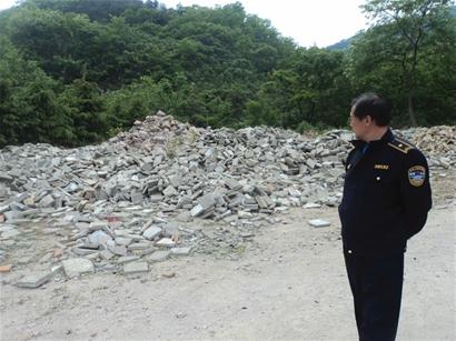 建筑垃圾怎能如此傾倒?記者隨后將問(wèn)題反映給了市浮山管理處,保衛(wèi)科工作人員吳先生和兩名市城管執(zhí)法局的城管隊(duì)員立刻趕到現(xiàn)場(chǎng)。 “這些都是山東頭村拉過(guò)來(lái)堆放在這里的,這片山坡是村里的土地?!惫芾硖幑ぷ魅藛T經(jīng)過(guò)調(diào)查后認(rèn)為,即使這片土地屬于山東頭村,也不能隨便將建筑垃圾傾倒在此。村里向工作人員解釋?zhuān)@些廢磚爛瓦并不是要丟棄在這里,他們有時(shí)還會(huì)派卡車(chē)來(lái)運(yùn)走一部分繼續(xù)使用。