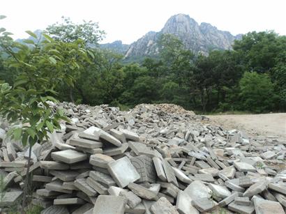 昨日中午1時(shí)許,記者分別從海龍路、海青路幾條道路前往浮山探訪。從海龍路梅嶺西路路口西側(cè)有一條上山小路,路面受損,鋪在路面的砂石已被碾出彎彎曲曲的車(chē)轍。 “都是些拉著磚塊的小卡車(chē),白天晚上都有,滿著上去空著下來(lái)。 ”附近一家小區(qū)的保安告訴記者,山坡上有一扇帶著鐵門(mén)的小院子,車(chē)都往里面開(kāi)。記者沿著浮山東麓向上攀爬了300多米找到了這處小院,周?chē)幕h笆將山坡圍起400多平方米。記者進(jìn)入鐵門(mén)后發(fā)現(xiàn),繼續(xù)上山的小路兩邊堆著約20堆廢舊磚塊,有的已經(jīng)堆起約兩米多高,遠(yuǎn)看上去,像是廢舊磚塊壘成的“墳堆”。