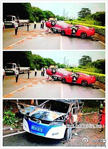 昨天凌晨,一輛紅色GTR(日產(chǎn)豪車)跑車和一輛寶馬車在深圳濱河大道玩起了飆車,紅色GTR在濱海大道由東往西行至僑城東路段,與同方向行駛的兩輛的士發(fā)生碰撞,造成的士車內(nèi)3人當場死亡,紅色GTR車內(nèi)一男三女也不同程度受傷。據(jù)深圳交警初步調(diào)查,紅色GTR司機侯某超速醉駕,逃逸7小時后又到交警部門自