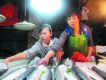 ????昨天中午,在大連路農(nóng)貿(mào)市場(chǎng)的一個(gè)海鮮攤前,攤主崔為艷正蹲在攤位后面吃午飯。有顧客買(mǎi)魚(yú),一個(gè)扎著馬尾辮子的可愛(ài)女孩閃了出來(lái),“你看魚(yú)眼睛,多新鮮?!彪S后,她熟練地揭開(kāi)魚(yú)鰓,給顧客看里面的粉紅色?!皟蓷l魚(yú)算你43塊吧,給你讓兩塊錢(qián)。要不要我給你剖開(kāi)? ”女孩把顧客相中的兩條魚(yú)裝袋稱重,順手拎過(guò)砧板。
