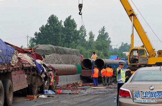 5月28日,救援人員在京珠高速信陽(yáng)段交通事故現(xiàn)場(chǎng)進(jìn)行處置。來(lái)自信陽(yáng)市高速交警支隊(duì)的消息顯示,5月28日6時(shí)37分至7時(shí)20分,京港澳高速公路953km至951km處(信陽(yáng)段)因突然出現(xiàn)團(tuán)霧引發(fā)交通事故。經(jīng)調(diào)查,共相繼發(fā)生交通事故13起,其中重大事故5起。截至目前,事故造成8人死亡,13人受傷。目前,傷者已得到救治,事故正在進(jìn)一步調(diào)查處理中,事故路段已經(jīng)恢復(fù)通行。