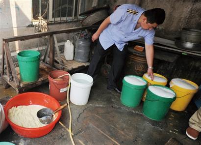 ????記者看到,豆腐生產(chǎn)的場所并非一個封閉的車間,而是處在露天的居民大院里,一口直徑約1.5米的大鍋里此時正煮著豆腐半成品,灶臺旁則是一片烏黑。觀察豆腐加工的環(huán)境,記者看到院子里不僅是污水橫流,而且到處堆著雜物,大大小小的塑料桶擺滿了院子,桶內(nèi)正盛著豆?jié){。工人們穿著拖鞋隨意進出生產(chǎn)現(xiàn)場,一根透明的膠管正拖在地上,而管子的一頭卻插在豆?jié){桶內(nèi)?!斑@個生產(chǎn)環(huán)境實在是太惡劣了,你這樣的生產(chǎn)環(huán)境肯定是不合格的,也太臟了。”在現(xiàn)場執(zhí)法人員對豆腐坊女老板說。