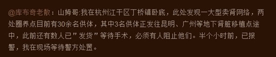 昨日下午,杭州市公安局江干分局官方微博“平安江干”發(fā)布消息:“根據(jù)《中華人民共和國刑法修正案(八)》第三十七條規(guī)定,報(bào)道所反映團(tuán)伙行為涉嫌組織販賣人體器官罪,現(xiàn)已組織分局刑偵大隊(duì)和轄區(qū)派出所組成專案組全力開展偵查工作。同時(shí),希望知道非法賣腎情況的群眾能積極撥打110,向警方提供線索?!?/p>