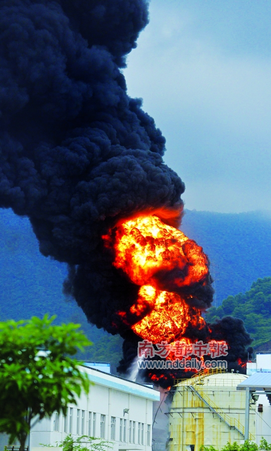 燃燒的儲(chǔ)罐不時(shí)發(fā)出巨響,濃煙伴著熊熊火焰沖上天空。
