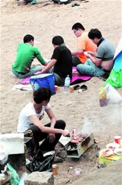 ????青島雕塑園管理辦公室的陶主任告訴記者,去年主要是周末有人來燒烤,今年不但周末人數(shù)增加到上百人,平常每天也都有20多人,人數(shù)比去年增加了五成多?!拔覀?名保安根本不夠用,攆走了這撥,又來了那撥,態(tài)度好的換個地方繼續(xù)燒烤,態(tài)度不好的連聽也不聽?!碧罩魅握f,每一次燒烤對環(huán)境都是一次傷害,除了玻璃碴子、鋼釬子容易傷人外,燒烤后撒漏的油污更是難以清除,20名環(huán)衛(wèi)工人每天要清理出1噸多燒烤垃圾,不少油污都是工人手把手地從沙子里摳出來的。