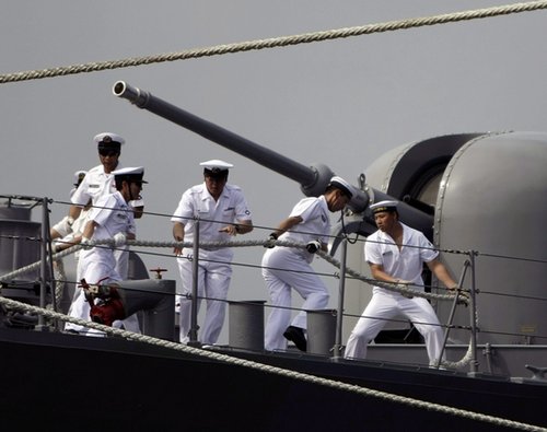 日本3艘訓(xùn)練艦28日抵達(dá)菲律賓進(jìn)行“友好訪問(wèn)”,士兵在軍艦上進(jìn)行作業(yè)。日菲聲稱此次訪問(wèn)與黃巖島局勢(shì)無(wú)關(guān)。