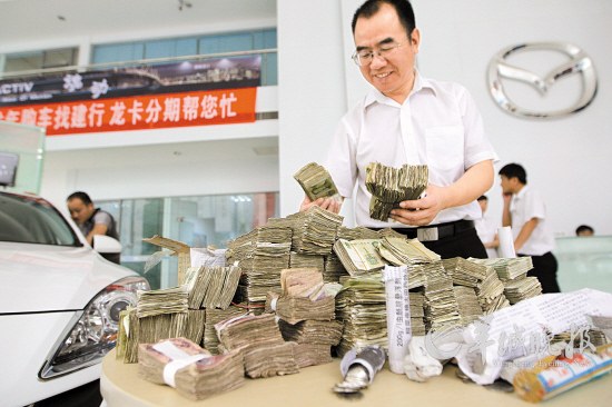 29日上午,在河南新宏源汽車銷售公司內(nèi),銷售經(jīng)理王先生告訴記者,張先生選中一款15.38萬元的轎車。28日下午,張先生來提車,“從車上搬下了十多箱零錢,說大概有10萬元,讓我們點(diǎn)點(diǎn)
