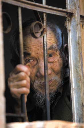 老人一見有人,雙手合十,嘴里不停地說:“謝謝?!彪S后,老人走到窗戶邊,瘦骨嶙峋地雙手抓住窗戶上的鐵欄桿,使勁往外看。老人從房間里伸出一根木棍,幾位村民用木棍把紙板支撐了起來,亮光這才投射到房間里。