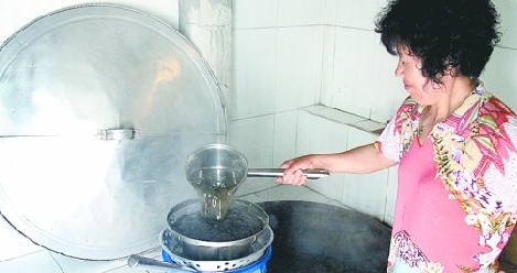 ????這樣又煮了大約兩三個小時后,姜豐菊看了看鍋里的湯汁,說可以盛出冷卻了。她拿來一個塑料桶,在上面放上一個漏勺、一個帶孔的金屬盆子和一個帶有過濾網(wǎng)的筐子,然后將鍋里的湯汁緩緩舀出來倒進去。記者也體驗了一下,舀出來的湯汁比較熱,能感覺到一股熱氣撲面而來。