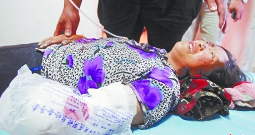 ????記者隨后趕到解放軍401醫(yī)院急診室,還沒走進急診室就聽見里面?zhèn)鞒鰜硗纯嗟暮奥?。記者看到傷者躺在病床上,左側胳膊手肘以下沒有了手臂,斷口處纏著厚厚的繃帶,但鮮血仍然浸透了繃帶,滲到床單上。滿頭大汗的劉女士痛苦地扭曲著身子,不停地痛哭慘叫。而在床邊圍著的幾個人盡管眼里噙著淚珠,但仍使勁摁住她的右手和腿,不讓她亂動以免加劇傷口疼痛。