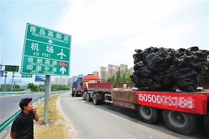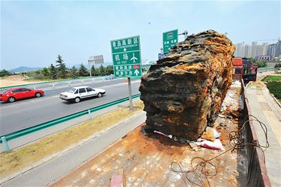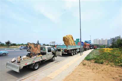 ????開著大卡車拉著10噸重的石頭跨省叫賣,由于城市里很多道路禁行大卡車,他們不得不專挑高速路或者國道、省道的入口將車停下,在路邊辦起了“展銷會”。昨日上午市民劉先生撥打晚報熱線反映,在遼陽東路的青銀高速入口處有幾輛卡車排開50多米長的車龍,占道經(jīng)營賣大石頭。記者經(jīng)調(diào)查了解到,這些人都是來自安徽靈璧的販石者,為節(jié)約成本,就在高速出口處停下了車,和交警、城管打起“游擊”。
