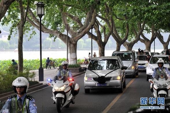 6月4日,在交警的開道下,載有吳斌的靈車在西湖邊駛過。