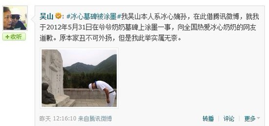 昨日上午11時(shí)40分左右,吳山在首篇博客中的第一句就是“我本人吳山,系冰心嫡孫。在此借博客,就2012年5月31日我在爺爺奶奶墓碑涂墨一事,向全國(guó)喜歡冰心奶奶的網(wǎng)友道歉。原本家丑不可外揚(yáng),我的行為實(shí)屬無(wú)奈。”