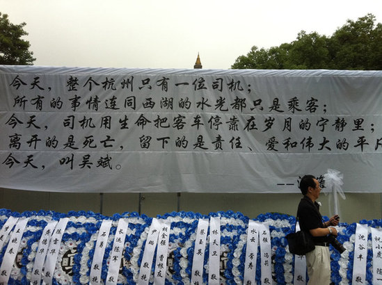 6月5日上午8時(shí)30分許,“最美司機(jī)”吳斌烈士追悼會(huì)在杭州殯儀館隆重舉行,來自中央部委、浙江省、杭州市的領(lǐng)導(dǎo)、吳斌親屬、吳斌生前所在單位領(lǐng)導(dǎo)和同事,以及來自社會(huì)各界人士及市民群眾約3000人參加了追悼會(huì),沉痛哀悼這位在生命最后時(shí)刻恪守職責(zé),挽救生命的平民英雄司機(jī)。