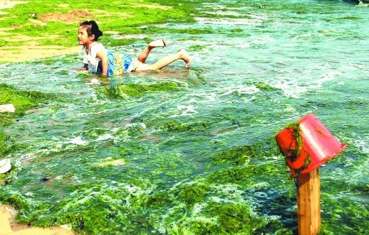 ????6月5日,出現(xiàn)在第三海水浴場和第六海水浴場的滸苔明顯比前一天增加。當天上午,記者從國家海洋局北海分局了解到,根據(jù)4日對黃海綠潮的監(jiān)測結(jié)果顯示,滸苔綠潮已經(jīng)靠近青島市區(qū)。