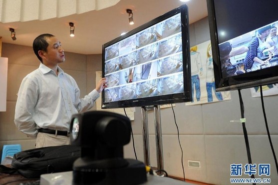 6月6日,在華東模范中學(xué)考點內(nèi),監(jiān)控室的屏幕上可監(jiān)控所有教室的實時情況。