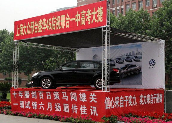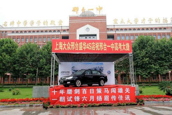 6月5日,高考在即,河北省重點中學邢臺一中在校園內(nèi)高調展出一輛轎車。該校校長高云洪對記者表示,轎車將獎勵給該校高三教師,“如何獎勵要等高考成績出來再說”。