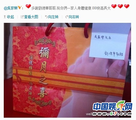 6月7日,TVB藝人吳家樂(lè)在微博上傳一張劉德華女兒彌月之喜的禮盒,禮盒里是傳統(tǒng)的滿月油飯,禮盒上印有劉德華女兒可愛(ài)的小手照片。吳家樂(lè)在微博中感謝劉德華,祝劉德華一家人身體健康,寶寶快高長(zhǎng)大。劉德華粉絲大贊偶像的心意,還紛紛求小龍女照片曝光。