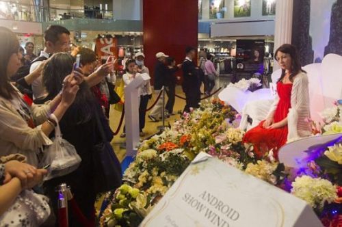 4月10日,中國(guó)香港的一個(gè)購(gòu)物中心,類(lèi)人機(jī)器人Geminoid F正朝著人們微笑