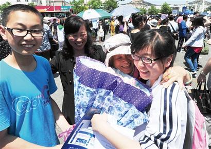 1中考生袁珊一出考場就受到父 母、姥姥、姥爺、姨媽和弟弟一家六口人的迎接(記者 于小陽 攝)