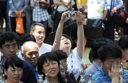 考試結(jié)束,家長舉起相機(jī)照下孩子走出考場的身影(記者 王建亮 攝)