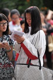 秀出“戰(zhàn)袍” “衣服上都是同學(xué)和好朋友的簽名,我們互相鼓勵迎戰(zhàn)高考!”昨天,在17中考點外,身穿寫滿姓名校服的女生王瑞?。ㄓ遥┦艿讲簧偌议L和考生關(guān)注(記者 陳珂 攝)