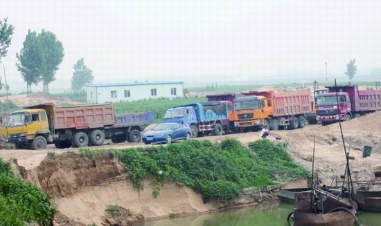 ????6月6日下午4時(shí)許,在李先生的指引下記者趕到代家店南的現(xiàn)場(chǎng),這時(shí) ,有兩艘抽沙船已經(jīng)開工,就聽河道里機(jī)器轟鳴,采沙船將河底的沙子不停地往外輸送。記者遠(yuǎn)遠(yuǎn)望去發(fā)現(xiàn),除了這兩艘船只外,在河道的南岸還停著幾艘沒有開工的船只,緊靠這些船只的岸邊堆積著大量的沙子。旁邊還停著十幾輛拉沙的大貨車,這些大貨車排成一隊(duì),正在等待著裝沙。
