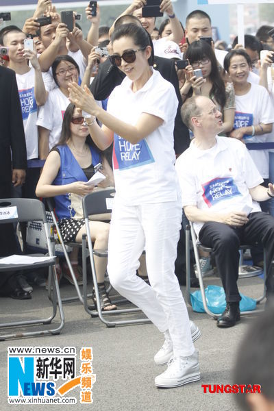 李冰冰不懼曝曬助陣接力跑 舉文件遮陽狂擦汗(組圖)