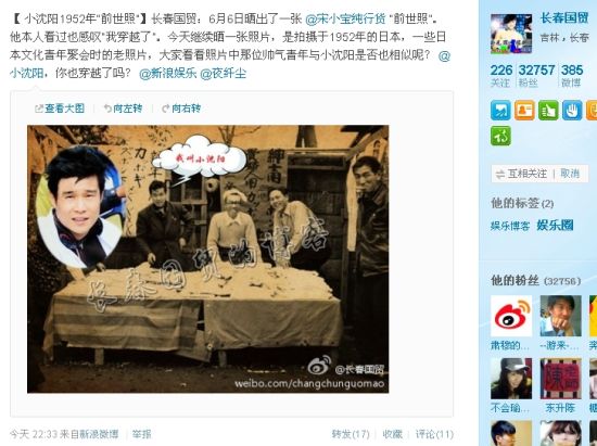 長(zhǎng)春國(guó)貿(mào)于6月11日22點(diǎn)33分發(fā)布的這條微博稱:“6月6日曬出了一張宋小寶純行貨‘前世照’。他本人看過(guò)也感嘆‘我穿越了’。今天繼續(xù)曬一張照片,是拍攝于1952年的日本,一些日本文化青年聚會(huì)時(shí)的老照片,大家看看照片中那位帥氣青年與小沈陽(yáng)是否也相似呢?小沈陽(yáng),你也穿越了嗎?”其下果然上傳了一張黑白老照片,只見照片中有一位身著西裝的俊朗青年,微笑看著鏡頭,其五官與神態(tài),與小沈陽(yáng)頗有幾分神似。