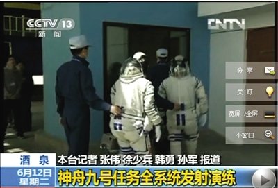 昨天上午,神舟九號任務(wù)進行全系統(tǒng)發(fā)射演練。執(zhí)行首次載人交會對接任務(wù)的航天員飛行乘組全程參與演練。