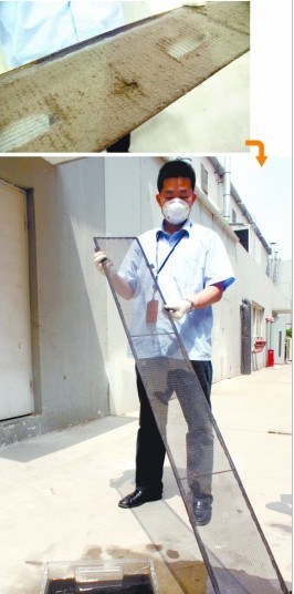 ????“清洗的話,肯定不能在辦公室里面,因為實在太臟了?!毙×指嬖V記者,需要把過濾網(wǎng)放到室外進(jìn)行沖洗,然后消毒才能重新安裝。記者看到,清洗員用水龍頭進(jìn)行清洗,流到地面的水立即變成了黑色,儼然一條“黑水河”。