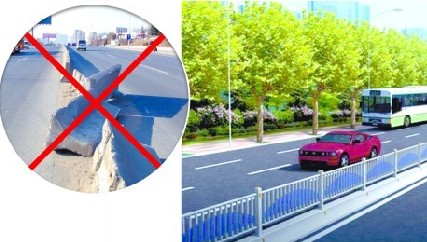 黑龍江路現(xiàn)在的隔離墩常被撞得左右歪斜。新型護欄效果圖