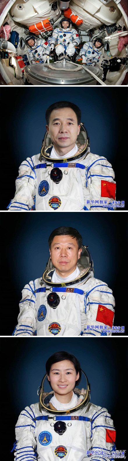 中國人民解放軍航天員大隊(duì)男航天員景海鵬、劉旺和女航天員劉洋組成“神九”飛行乘組,執(zhí)行中國首次載人交會對接任務(wù)。