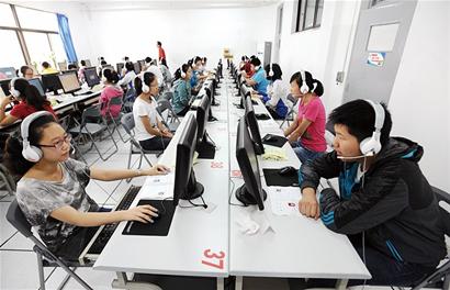 正式開考后,每個考生都對著電腦屏幕大聲地朗讀,整個教室里頓時變得嘈雜起來,不過由于戴著隔音耳機,考生相互之間并不受干擾。