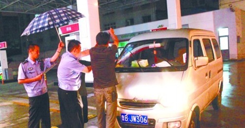 ▲利津路一加油站內(nèi),交警正在勘查停在此的肇事車輛。
