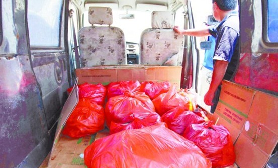????在另外一個車間堆著近十大包已經包裝好的熟食,送貨單上寫著送貨單位是“撫順路”,供應豬頭肉、苦腸、豬肺以及火腿腸等熟食。