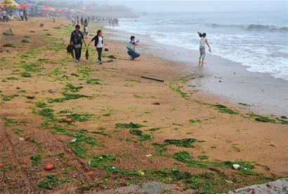 昨日中午,記者來到第六海水浴場,只見沙灘上零星分布著一些滸苔,海面沒有漂浮滸苔,工作人員正將沙灘上的零星滸苔撿拾到袋中,運(yùn)到岸邊等待車輛拉走。浴場場長韓培金告訴記者,昨日一大早滸苔就“上岸”了,市南環(huán)衛(wèi)100多名工人迅速趕來進(jìn)行清理,四個小時就清理了四五噸滸苔。昨日下午,記者在石老人海水浴場看到,沙灘上幾乎沒有滸苔。