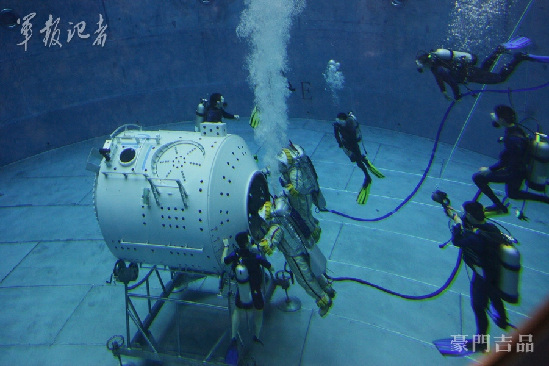 “神九”飛天在即,記者走進(jìn)航天中心,探秘航天城。航天員進(jìn)行模擬失重水槽訓(xùn)練。(記者張曉祺 攝)