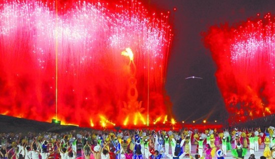 ????最激動人心的時刻在當晚9時30分許到來。5名火炬手依次帶著從上屆亞沙會舉辦地馬斯喀特采集來的火種繞場一周后,將最后一棒火炬?zhèn)鬟f給北京奧運會跳水冠軍王峰。王峰慢慢舉起火炬,一個手打燈籠的小姑娘出現(xiàn)在他面前,王峰的火炬和小姑娘的燈籠在空中進行了一個象征意義的對接,恰在這時,一只散發(fā)著銀色光芒的“海鷗”從上空飛起,它嘴中的引線已然被火炬點燃。此后,在全場觀眾屏住呼吸的注目中 ,“海鷗”緩緩飛向主火炬塔。頃刻之間,小小的火種點燃引線,萬道火光聚集在一起向前沖去,主火炬瞬間熊熊燃起!
