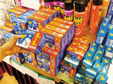 記者近日探訪了島城多家超市發(fā)現(xiàn),蚊香、驅(qū)蚊液、驅(qū)蚊片、殺蟲劑、電蚊拍等驅(qū)蚊滅蚊商品可謂琳瑯滿目,不少以前少見(jiàn)的高科技驅(qū)蚊工具紛紛登場(chǎng)。在香港中路一家超市百貨區(qū),記者看到貨架上擺放著各種樣式的蚊香。超市導(dǎo)購(gòu)人員告訴記者,近日天氣越來(lái)越熱,選購(gòu)蚊香的市民明顯增多,超市兩三天就會(huì)補(bǔ)一次貨。