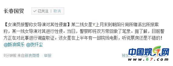 今日,網(wǎng)友“長春國貿(mào)”在微博爆料,稱國內(nèi)某二線女演員遭一線女導(dǎo)演性侵后報案。