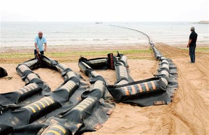 ????昨天,青島市針對滸苔的攔截工作已經(jīng)展開,記者昨天在二浴、三浴看到,為了預(yù)防滸苔影響市民到浴場活動,浴場管理方昨天使用漁船將總共上千米圍欄拖到防鯊網(wǎng)外,攔截滸苔。