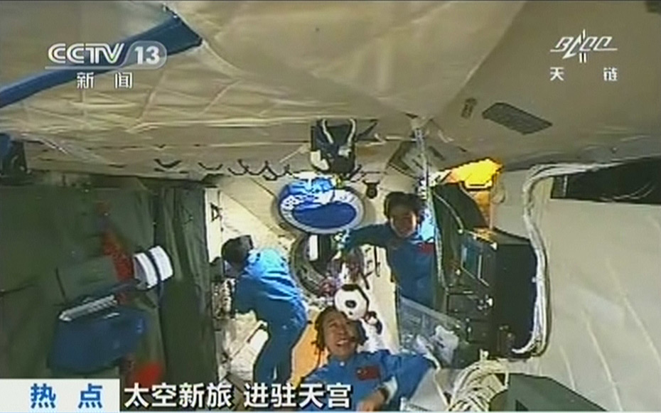 天宮一號與神舟九號組合體20日晨6時許“轉(zhuǎn)正飛行”,從交會對接的倒飛狀態(tài)進(jìn)入正常的飛行,形成天宮在后正飛,飛船在前倒飛的飛行模式,這也是組合體的標(biāo)準(zhǔn)飛行姿態(tài),為第二次交會對接做好準(zhǔn)備。圖為航天員劉洋和劉旺在天宮內(nèi)玩熊貓玩偶。(電視截圖)