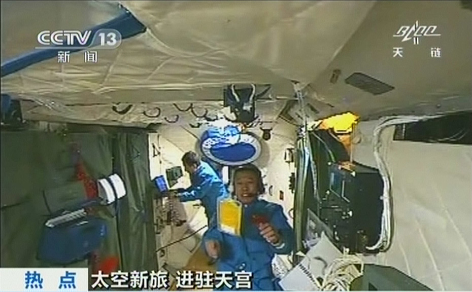 天宮一號與神舟九號組合體20日晨6時許“轉(zhuǎn)正飛行”,從交會對接的倒飛狀態(tài)進(jìn)入正常的飛行,形成天宮在后正飛,飛船在前倒飛的飛行模式,這也是組合體的標(biāo)準(zhǔn)飛行姿態(tài),為第二次交會對接做好準(zhǔn)備。圖為航天員劉旺在天宮旋轉(zhuǎn)物品。(電視截圖)