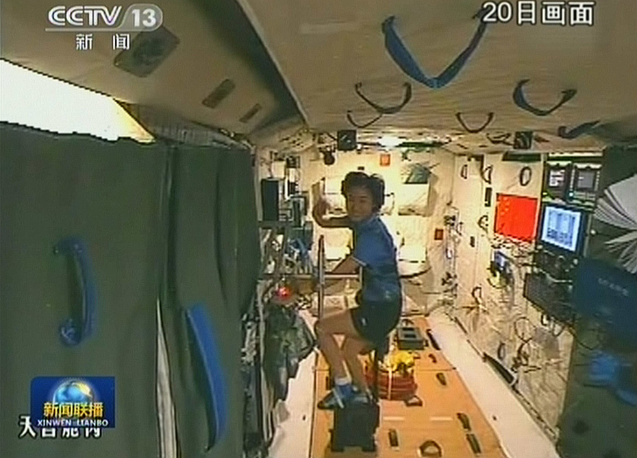 天宮一號與神舟九號組合體20日晨6時許“轉正飛行”,從交會對接的倒飛狀態(tài)進入正常的飛行,形成天宮在后正飛,飛船在前倒飛的飛行模式,這也是組合體的標準飛行姿態(tài),為第二次交會對接做好準備。圖為女航天員劉洋在天宮內騎單車。(電視截圖)