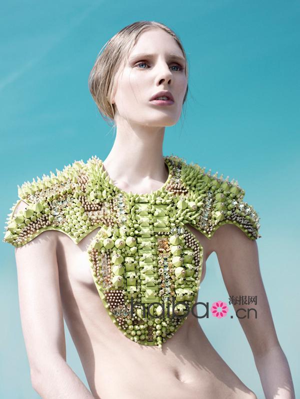 一件覆蓋了肩部、胸部的熒光綠色“盔甲”,實(shí)則是一條項(xiàng)鏈,設(shè)計(jì)師Heaven Tanudiredja的作品留給人的第一印象便是如此震撼——極其夸張的體積、出眾的立體感與搶眼的色彩。