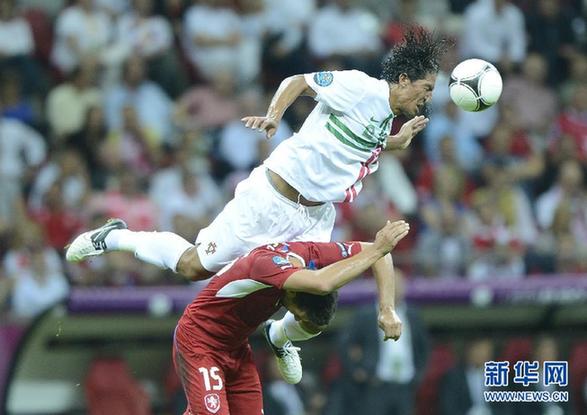 6月21日,葡萄牙隊球員阿爾維斯(上)在比賽中與捷克隊球員巴羅什拼搶。當日,在波蘭華沙進行的2012歐洲足球錦標賽首場四分之一決賽中,葡萄牙隊對陣捷克隊。