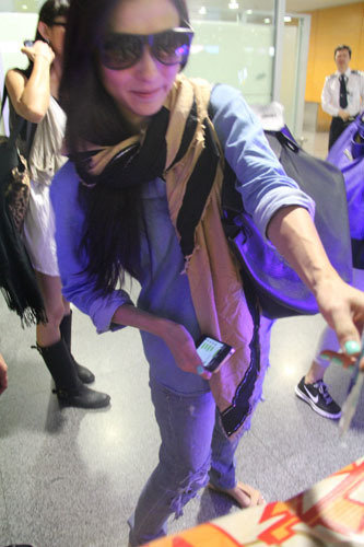 一下飛機,張柏芝就忙著玩手機,鏡頭拉近一看,原來張柏芝也在玩最近很流行的“微信”。看見粉絲來接機,其趕緊笑臉相迎,還送粽子給他們,十分親和。