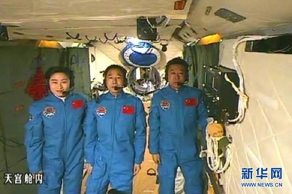 6月26日,胡錦濤來到北京航天飛行控制中心,與正在天宮一號(hào)里開展科學(xué)實(shí)驗(yàn)的航天員通話。這是航天員在通話。新華社發(fā)(截屏照片)